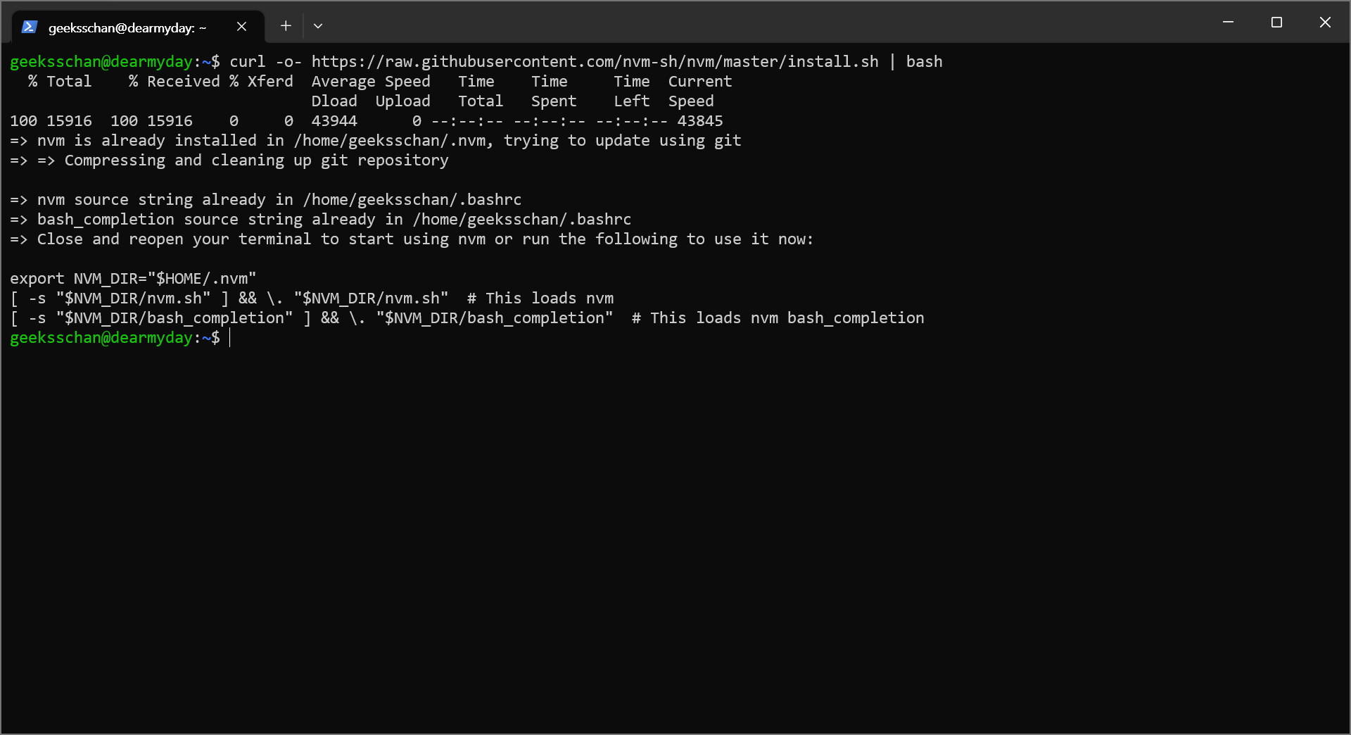 curl -o- https://raw.githubusercontent.com/nvm-sh/nvm/master/install.sh | bash